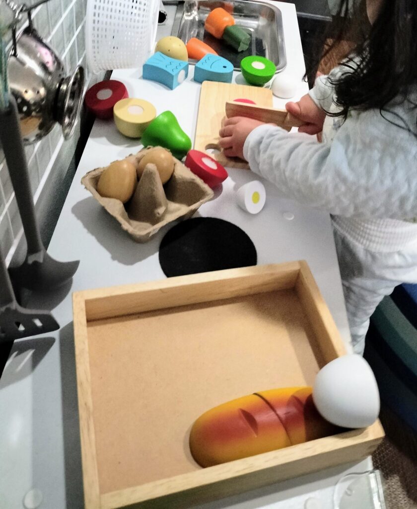 保育園ではプラスチック製の食べ物が多いので、家では木の温もりを感じられるおもちゃで遊んでほしいと思っていました。